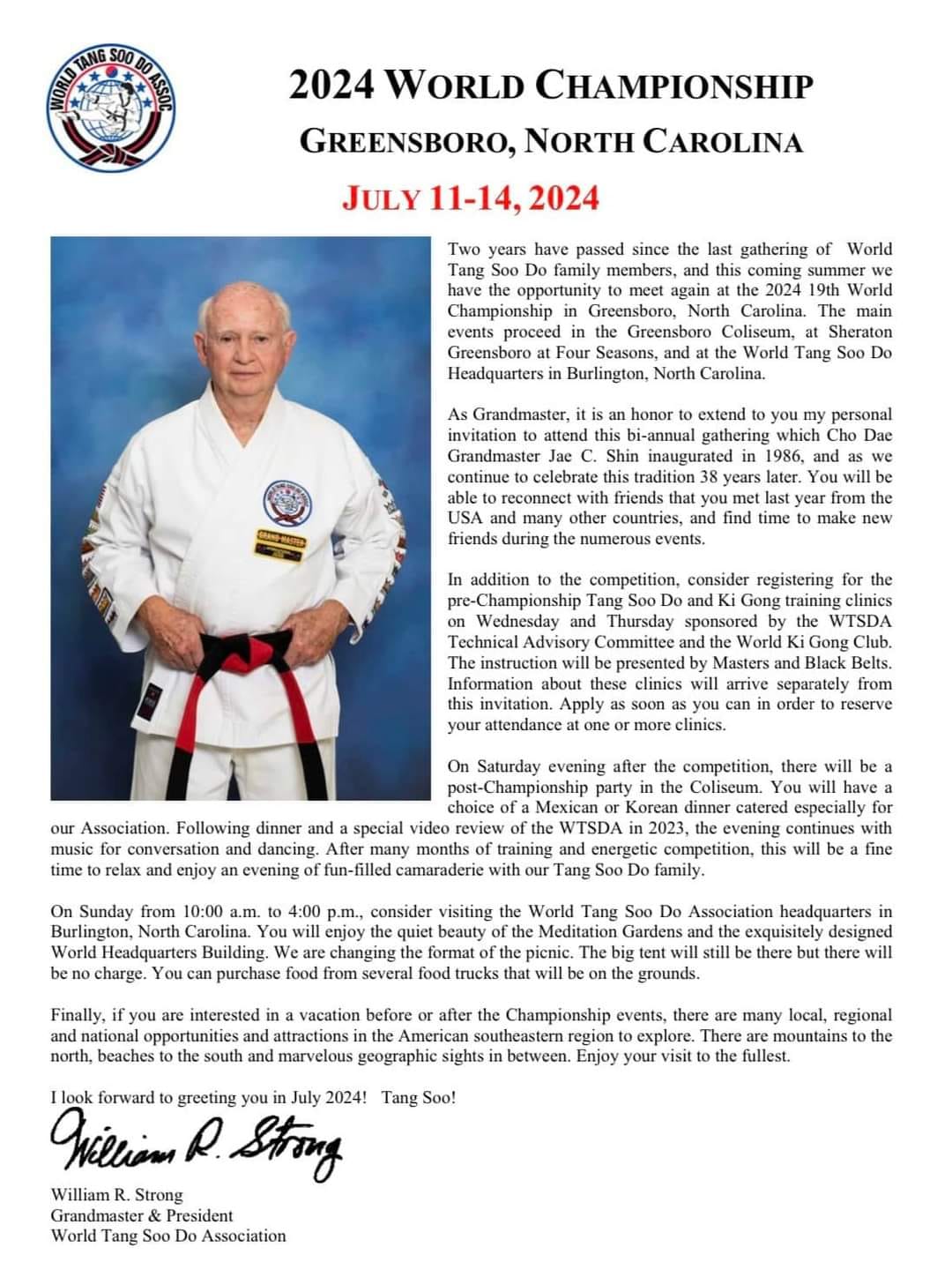 "Han pasado dos años desde la última reunión de los miembros de la familia del Tang Soo Do, y tenemos la oportunidad de encontrarnos nuevamente en el 19º Campeonato Mundial en Greensboro, Carolina del Norte.