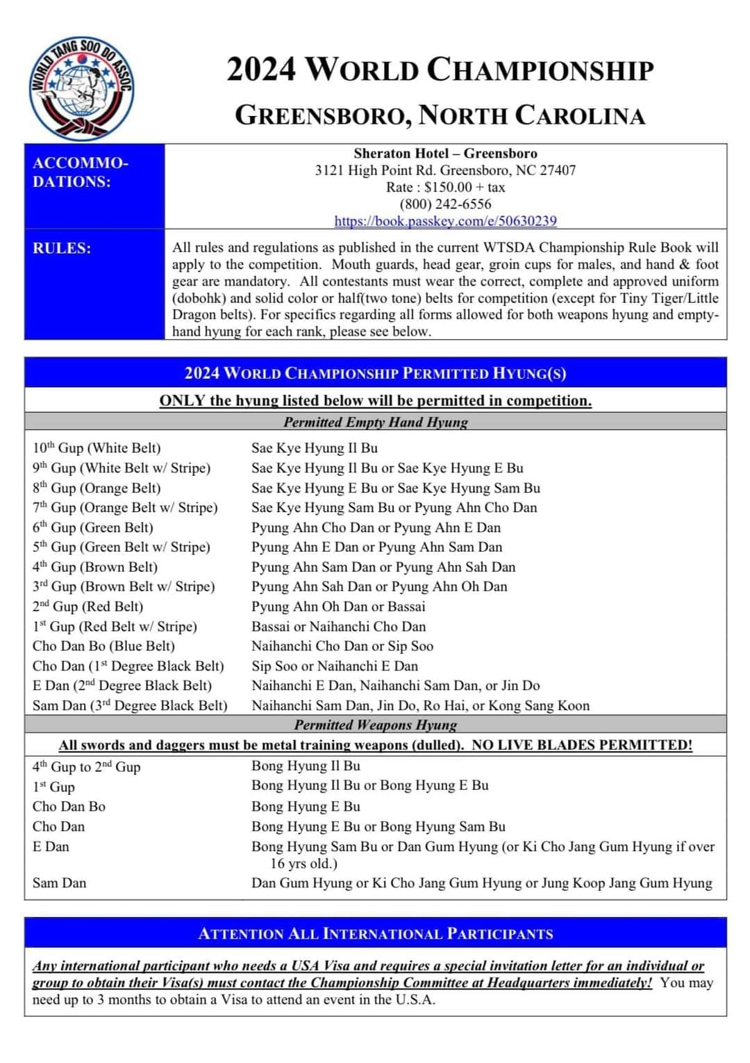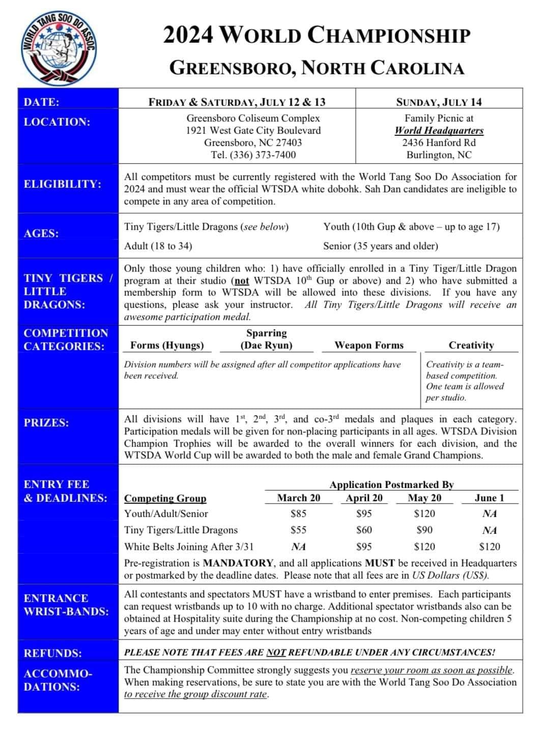 Los eventos principales se llevarán a cabo en el Coliseo de Greensboro, en el Sheraton Greensboro en el Four Seasons así como en la Sede Mundial de Tang Soo Do en Burlington, Carolina del Norte.
