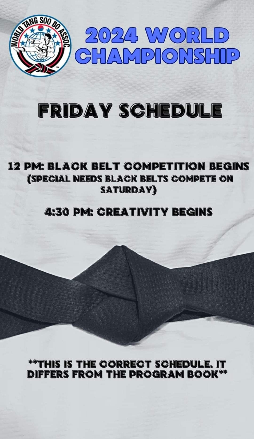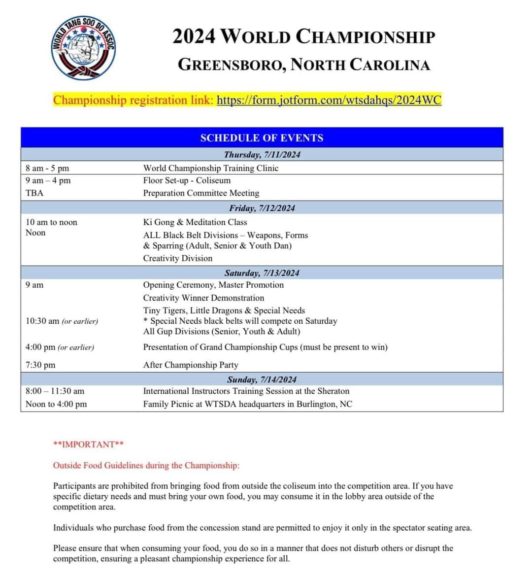 Además de la competencia, considera inscribirte a las Clínicas de entrenamiento Pre Campeonato de Tang Soo Do y de Ki Gong. Estas clínicas se llevarán a cabo el miércoles y jueves, esponsoreadas por el comité de consejo técnico de la WTSDA y el club mundial de Ki Gong. Los seminarios serán impartidos por Maestros y Cinturones Negros. La información de estas clínicas se entregará separada de esta invitación. Regístrate tan pronto como puedas para reservar tu participación en una o más clínicas.
