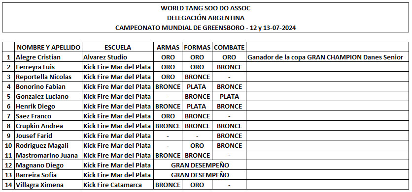 Campeonato Mundial de la World TangSooDo Assoc. realizado en la ciudad de Greensboro, USA durante los días 11 al 13 de Julio 2024.