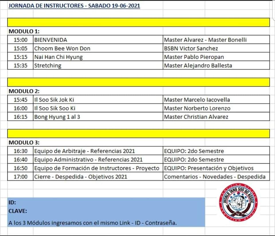 Hoy Sabado 19 de Junio, se llevó a cabo un encuentro de Instructores de la Argentina, Chile y Ecuador. Fueron 3 módulos por App Zoom, donde los dos primeros fueron destinados a la practica de programa y el tercero a la presentación de los proyectos de trabajo con los Equipos de Arbitraje, Administrativo y el de Formación de Instructores. Todos ellos tienen un único objetivo que es trabajar por el crecimiento de cada uno de los miembros, de sus escuelas y de la World TangSooDo Assoc.